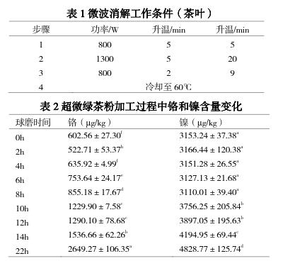 血[6];過量的鎳可引起炎癥、癌癥、癥、系統(tǒng)紊亂、降低生育能力、致畸和致突變等[7];鉻雖是人體必需的微量元素,但高鉻的食用也會引起不適[8]。超微綠茶粉是將達到綠色標準的綠茶茶葉,經(jīng)超微粉碎形成 200 目(74μm)甚至達到 1000 目(12μm)以上的綠茶超微細粉[9-10]?,F(xiàn)階段我國企業(yè)大多采用球磨方式加工超微綠茶粉,在球磨加工過程中,茶葉被粉碎的同時,研磨材料本身也會發(fā)生變化,從而可能給超微綠茶粉帶來重金屬污染。另外,與傳統(tǒng)茶葉不同的是,超微綠茶粉屬于茶葉深加工范疇,常被以全組分形式加入到食品和化妝品中[11],又因其中的重金屬元素應(yīng)滿足《食品標準食品中污染物限量》和《茶葉中鉻、鎘、汞、砷及氟化物限量》對茶葉中重金屬限量要求[12-13],因此應(yīng)對超微綠茶粉加工過程中重金屬污染給予關(guān)注,但目前對超微綠茶粉加工過程中的重金屬含量變化未見報道。本文對球磨加工過程中超微綠茶粉的重金屬含量進行檢測分析,同時,采用三組球磨材料不銹鋼球-不銹鋼罐、氧化鋯球-不銹鋼罐、瑪瑙球-尼龍罐對超微綠茶粉進行加工,通過重金屬元素鉻和鎳的檢測,并結(jié)合粒徑分析,為尋找合適的球磨材料提供依據(jù)。