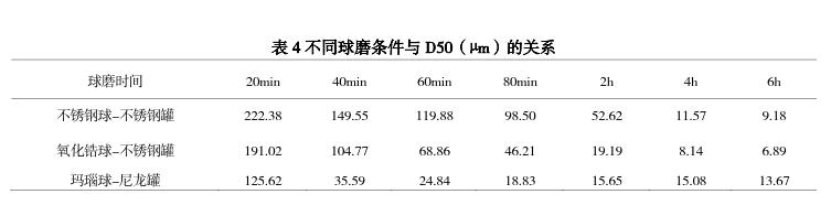 將蒸青片用 YXQM-4L 行星式球磨機分別采用不銹鋼球-不銹鋼罐、氧化鋯球-不銹鋼罐、瑪瑙球-尼龍罐進行 20min、40min、60min、90min、2h、4h、6h 的球磨(料球比為 45g:493g,大中