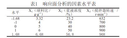 影響球磨機(jī)超微粉碎效果的主要因素有球料比、攪拌器轉(zhuǎn)速、枸杞子渣漿液濃度和粉碎介質(zhì)。因此本研究以上述3個(gè)因素作為試驗(yàn)因素,固定球磨介質(zhì)為Φ10mm氧化鋯球,在單因素試驗(yàn)的基礎(chǔ)上,通過響應(yīng)面分析化佳工藝參數(shù),以粉碎后的顆粒粒度d50作為超微粉碎評(píng)價(jià)效果。
